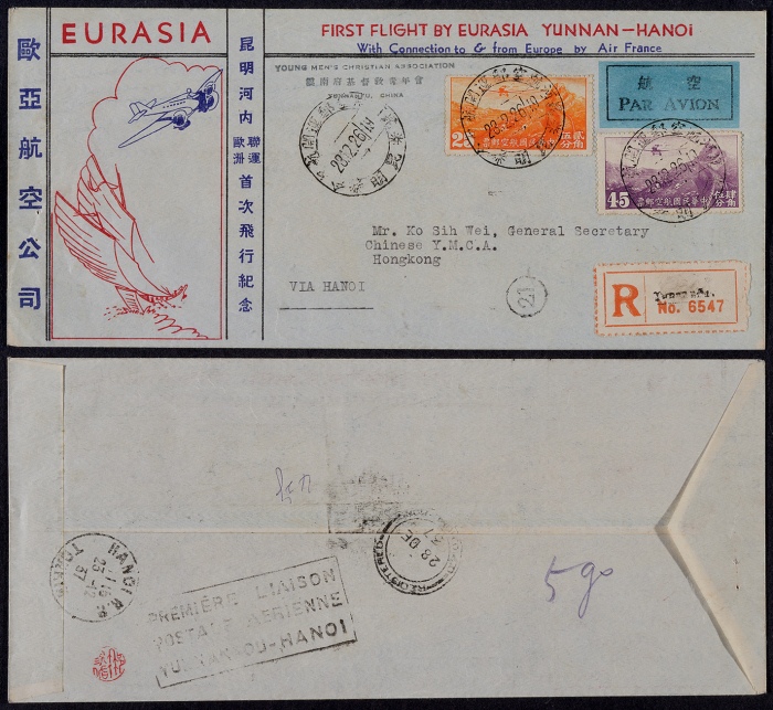 1937年昆明寄香港挂号首航封,欧亚航空公司昆明-河内首次飞行纪念封,贴北京三版航邮25分、45分各一枚,计符邮资70分,销“昆明26.12.23昆河航空邮运开航纪念”邮戳,贴“航空”、“挂号”条各一枚,背盖河内英文首航纪念戳12.23日戳中转,落地香港12月28日到戳,背钤那家佑藏 ...