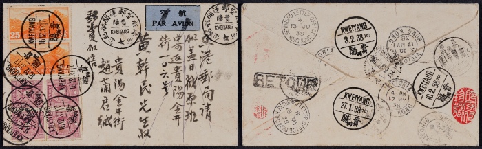 1937年贵阳寄香港首航转寄昆明再寄香港封,贴北平三版航邮25分两枚(往返航空邮资50分),烈士像2.5分四枚(往返信函邮资10分),销贵阳12月16日英汉三格日戳,贴“航空”签条,另盖“航空邮运-贵阳(中英文)纪念”圆形纪念邮戳二枚,背分盖贵阳1938.1.27/2.3/2.10不同日期戳 ...
