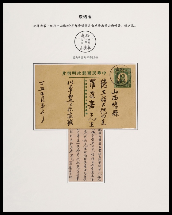 1937年绥远卓资山寄忻县孙中山像邮资片,中文版孙中山像2.5分邮资片,销绥远卓资山一月五日三格外圆实线内点线款式日戳,较少见,保存较好,带展页