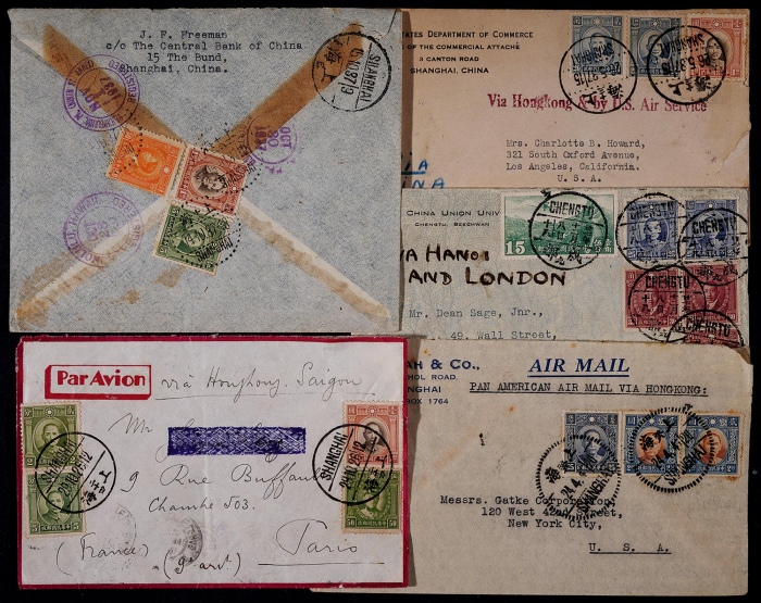 1937-41年国际航空封一组5件,有上海寄美国4件,分贴孙中山像、烈士像票,邮资不同157分、145分、425分,1937年10月14日发出封,贴票其中北平版烈士像40分齿孔移位,另有成都1938年12月8日寄美国一件,贴北平三版航空15分一枚、伦敦版孙像25分两枚、北平版烈士像30分三枚,封 ...