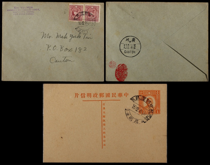 1937年云南府寄广州试航封及盖销试航纪念邮戳片一组2件:贴烈士像2分半邮票两枚,平信5分(试航免航空邮资),销“昆明26.12.16昆河航空邮运试航”破框纪念邮戳,背落盖广州1938年1月13日到戳;中文片名孙中山像1分邮资片,盖“昆明26.12.16试航邮戳,此封到达和内又由陆路转 ...