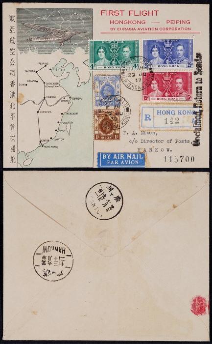 1937年香港寄汉口首航挂号纪念封,欧亚航空公司香港北平首次开航纪念封,贴英皇佐治六世加冕纪念邮票三全及普票10分、1分各一枚,销香港1937年6月29日戳,贴挂号及航空签条各一枚,落地汉口6月30日到戳,回航盖广州7月9日戳,封品精美 ...
