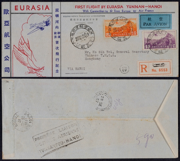 1937年昆明寄河内中转香港首航挂号封,欧亚航空公司昆明-河内首飞纪念封,贴北平三版航邮25分、45分各一枚,计符邮资70分,销“昆明26.12.23昆河航空邮运开航纪念”邮戳,背盖“云南府-河内”英文指示戳,贴“航空”、“R昆明NO.6553”英文挂号条,有越南河内12.23日戳中转, ...