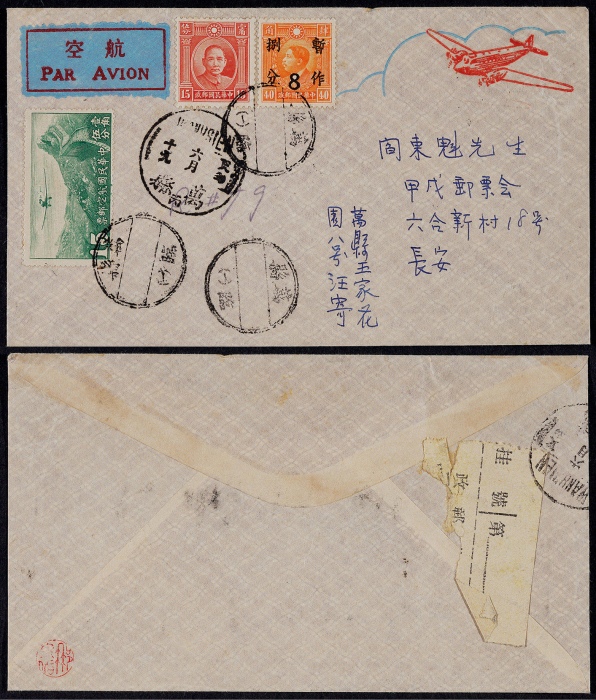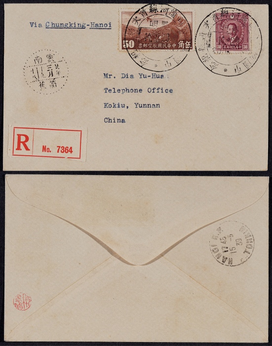 关于 ,北京二版帆船限滇加盖6分、7分各一枚,计符邮资38分(溢贴半分),销“昆明35.7.12渝昆航空邮运开航纪念”邮戳,另盖“R挂号”红戳,背盖贵阳廿四年七月十二同款的评论
