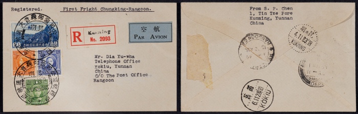 1939年昆明寄仰光转个旧首行挂号封,贴北平三版航邮60分、烈士像40分、及孙中山像20分,5分各一枚,计符邮资125分(国际信函50分+航空25分+挂号50分),销“昆明39.10.30中国航空公司渝仰线首次通航纪念”邮戳,贴“R NO.2093”挂号条及航空条各一枚,背盖仰光11月1日到戳,昆 ...