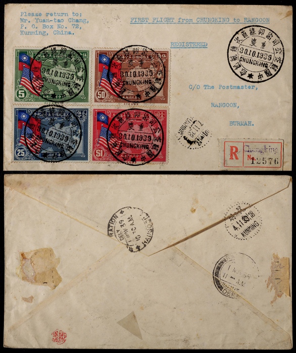1939年重庆寄仰光转昆明首航挂号封,贴民国庆美纪念邮票全套4枚,计邮资175分,销“重庆1939.10.30中国航空公司渝仰线首次通航纪念”双圈内圆汉英三格款式邮戳,另贴R重庆(12576)挂号条,落地背盖缅甸仰光11月1日戳,中转,有昆明11月7日到达戳,附此封重庆挂号执据,保存完 ...