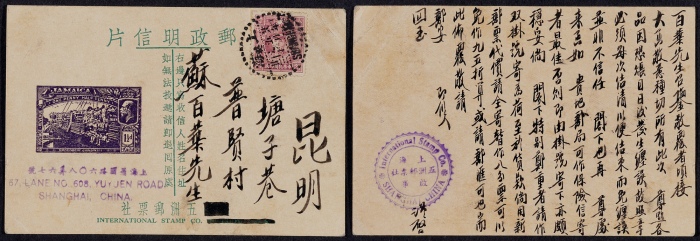 1939年五洲邮票社邮政明信片上海寄昆明,贴北平版烈士像2.5分明信片符资,销上海(癸)廿八年五月廿三点线小三格日戳,自然实寄昆明,片背书写邮率内容,并钤上海五洲邮票社启事戳,收件人为著名云南收藏家苏百华先生,民国时期集邮史研究较好素材,保存较好<br><br>那家佑著 ...
