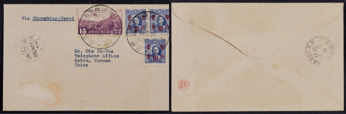 1939年昆明寄河内转个旧挂号首航封,贴北平三版航邮45分一枚,伦敦版孙中山像改值暂作10分三枚,计符邮资75分(信函25分+挂号25分+航空25分),销“昆明28.3.14中国航空公司渝河线首次通航纪念”邮戳,落地河内3月15日转个旧3月19日到达,封原贴“挂号”条失落,背钤那家佑藏 ...