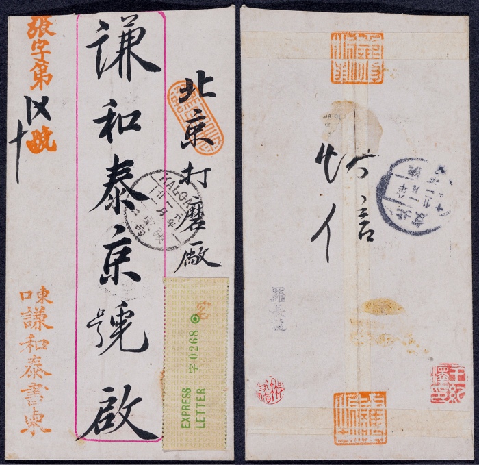 1912年张家口寄北京快信封,“东口谦和泰书柬”红框封,盖张家口(丙)元年一月廿一英汉三格式日戳,贴“字268”快信邮票,背落盖次日北京(快递)元年一月廿二到达戳,罕见品,背钤著名集邮家王纪泽、那家佑藏印,保存完好 ...