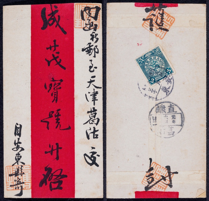 1912年密云寄天津挂号红条封,背贴蟠龙加盖宋字“中华民国”4分直双连,挂号信函邮资8分(信函3分+挂号5分),销直隶密云元年八月十七腰框日戳,并盖密云手填(227)挂号戳,经北京(丁)八月十九中转,到达天津盖八月十九-天津城八月二十转落戳各一枚,封品完好 ...