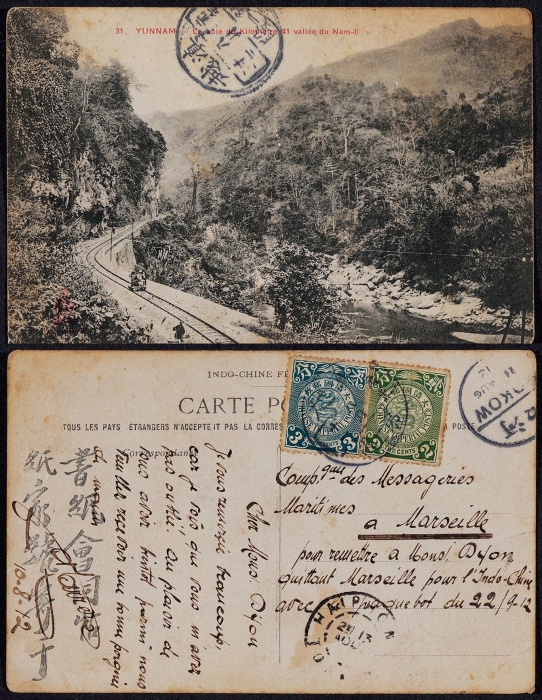 1912年滇越火车邮局寄法国明信片,贴蟠龙2分、3分各一枚,销“滇越第一段元年八月十一”火车邮局腰框式日戳,另盖河口8月11日汉英半切小圆日戳—法国客邮8月13日转口戳各一枚,片背摄影图:深山中的火车线路,保存较好 ...