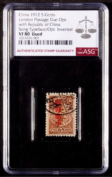 1912年棕欠资5分加盖宋体“中华民国”旧票一枚,倒盖变体,销江门戳,ASG评级80分
