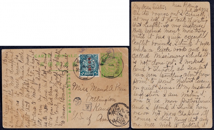 清四次邮资片1912年北京寄美国,加贴蟠龙加盖宋体“中华民国”3分一枚,国际明信片邮资4分相符,销北京(东)七月廿四英汉腰框式日戳,另盖“五”、“五二”小圆筒戳,奉天7月26日汉英半切小圆戳转口,片经日本中转,盖横滨7月30日戳,保存较好 ...