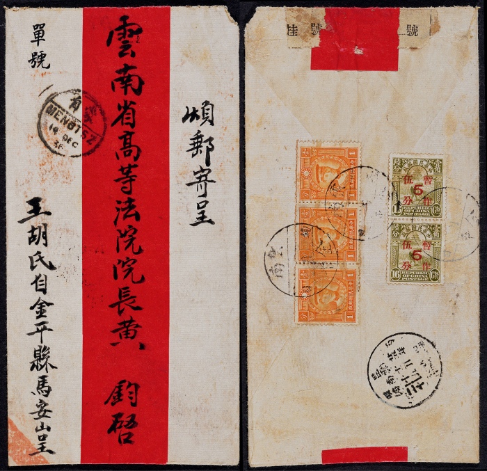 1936年云南金平寄昆明挂号红条封,背贴北平版烈士像1分三枚,农获图加盖改值暂作5分两枚,单挂号邮资13分(信函5分+挂号8分),销“云南金平 年 月 日”手填三格戳,贴挂号条,另盖蒙自12月14日汉英半切小圆日戳中转,落地昆明12月15日到达戳,封品上佳,蒙自半切小圆戳较晚实 ...