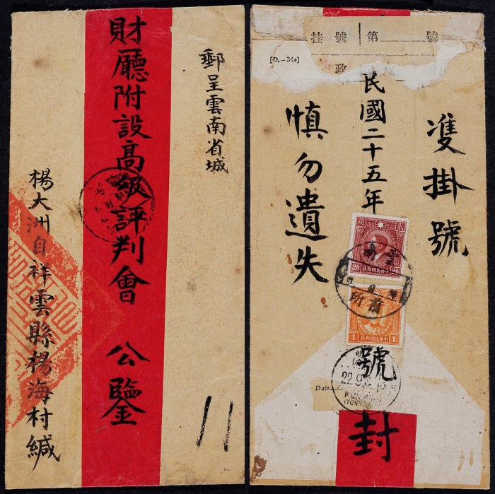 1936年云南漾濞县寄昆明超重双挂号封,红框封贴北平版烈士像8分及伦敦版孙中山像5分各两枚,计符邮资26分(信函5分×2+单挂8分+回执8分),销云南漾濞11月5日腰框式日戳,并盖R漾濞县挂号手填编号戳,有中转及昆明11月9日到达戳,云南邮史研究组集少见素材,保存完好 ...