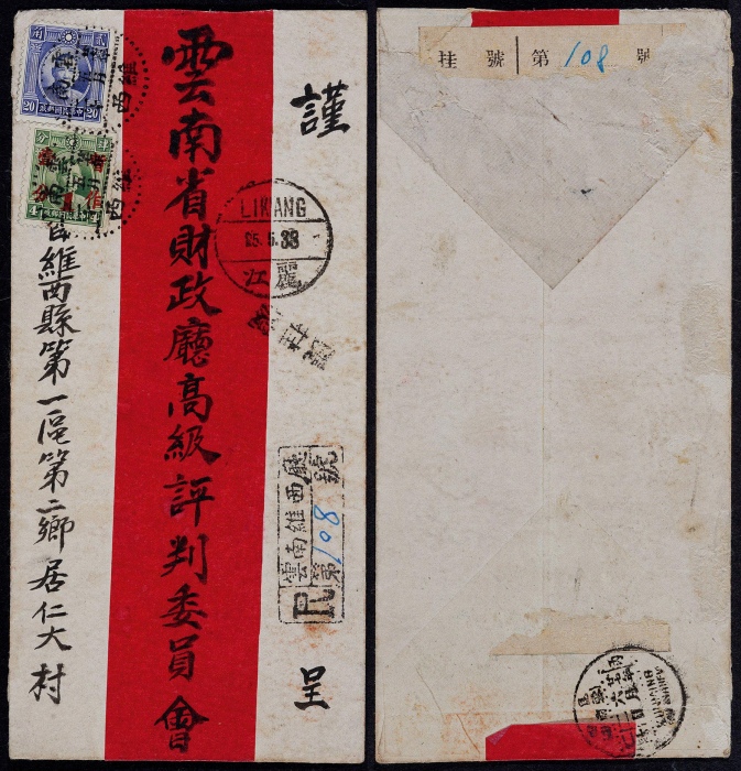 1938年云南维西寄昆明双挂号红条封,贴伦敦版孙中山像20分、4分加盖暂作1分各一枚,计符双挂号邮资21分,销云南维西5月20日小三格点线日戳,并盖R云南维西第(108)号手填挂号戳、“双挂号”邮政副戳各一枚,经丽江5月25日中转,落地背盖昆明6月2日到达戳,有原信,民国云南小 ...
