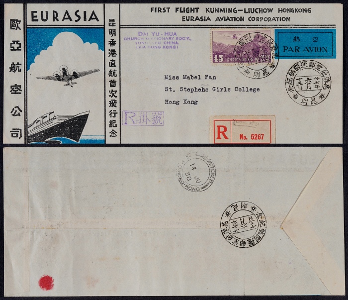 1938年昆明寄香港挂号首航封,欧亚航空公司昆明香港直行首次纪念封,贴北平三版航邮45分一枚,销“昆明廿七年六月十三日昆港航空邮运开航纪念”邮戳,另盖“R挂号”紫色戳,贴“航空”及“R NO.5267”昆明挂号条各一枚,落地背盖香港6月14日到戳,封品精美 ...