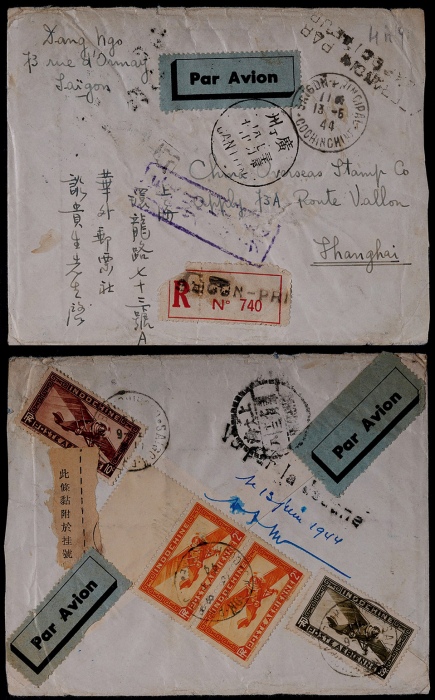 1944年西贡寄上海挂号航空进口封,背贴印支航空邮票2元二枚、10分及39分各一枚,销西贡6月13日戳,贴R挂号、航空签条各一枚,进口广州7月8日中转,并盖“广州续飞”邮政指示紫色戳,落地上海7月13日到达戳,保存完好 ...