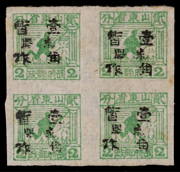 华东区1944年战士图2分加盖胶东暂作壹角新票四方连,上中品,方连非常珍罕,著名集邮家范兰如旧藏