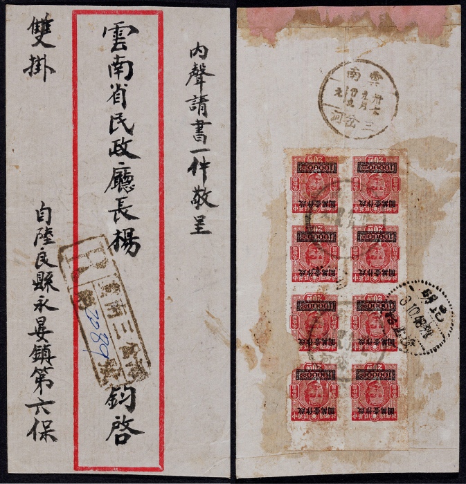 1948年云南三岔河寄昆明双挂号封,红框封背贴重庆中央版孙中山像长框改值高额1万元八方连(右边2枚有损),计8万元(信函1万5仟+单挂3万+回执3万5仟),销云南三岔河九月廿九三格式日戳,正盖R三岔河第(2089)号”手填挂号戳,笔注:双挂,落地昆明投递抬10月8日到达戳,民国 ...