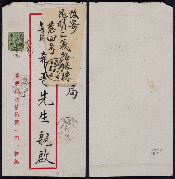 1948年昆明寄本埠改寄梁河设置局金元封,红框封贴中信版孙中山像金元改值10分平信邮资,销昆明12月11日汉英小三格点线日戳寄本埠,落地贴改寄批条,销“云南梁河设治局遮岛十二月廿四”无内框圆形款式日戳,较少见,封品完好 ...