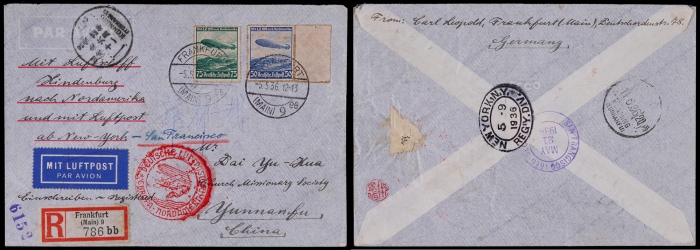 1936年德国兴登堡飞艇转寄昆明挂号航空封,贴德国兴登堡航空邮票50分尼及75分尼各一枚,销法兰克福5月5日戳,经纽约5月9日、旧金山5月21日,转至昆明1936年6月1日落地,背钤那家佑藏印,封品上佳,转运云南者仅见三枚,非常罕见<br><br>那家佑著:云南早期航空邮政史(1918-19 ...