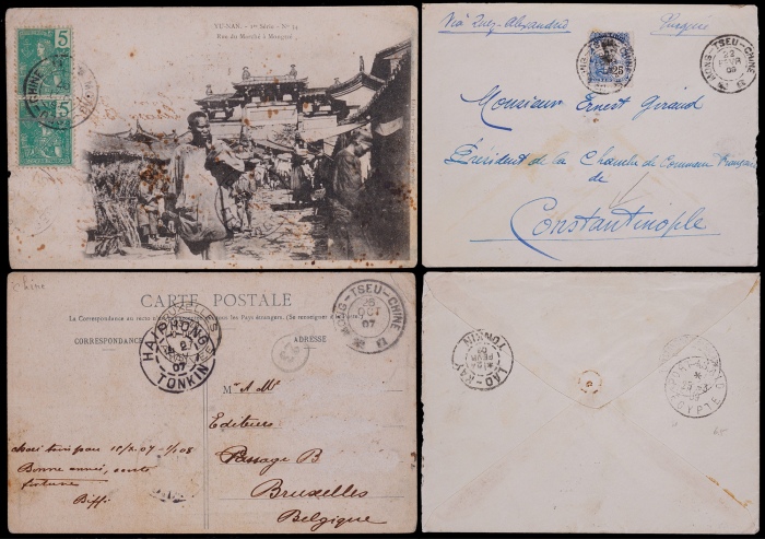 1907年蒙自寄国际封2件:红条封洋人横用书写寄法国封,贴法国客邮加盖蒙自改值2分、花银1分、花银4厘各一枚,销蒙自法国客邮4月6日戳,经老街4月8日、越南西贡4月18日中转,落地尹士坦丁堡5月15日到达戳;西式封寄土耳其,贴法客邮蒙自改值1角一枚,销蒙自法客邮4月10日戳,经 ...