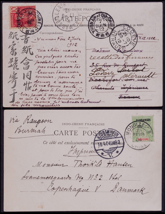 云南府寄欧洲明信片一组2件:1904年寄丹麦片,贴法客邮加盖“YUNNANSEN”(云南府)改值二仙邮票,销云南府蒙自2月25日“B”型日戳,另盖有丹麦4月16日到达戳,邮程历时50天,云南府使用MONGTZE B”日戳罕见;1912年“永庆安澜”摄影图片寄法国,贴法兰西神像10生丁邮票,销云 ...