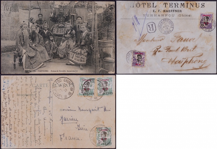 云南府寄国际封片一组2件:1915年寄越南海防挂号封,贴法客邮安南妇女图加盖“YUNNANFOU”(云南府)改值1角、4分各一枚,计邮资14分,销云南府4月30日戳,另盖“R”挂号戳发海防;1921年寄法国明信片,贴法客邮安南妇女图,加盖云南府改值2分三枚,邮资6分,销云南府法国客邮 ...