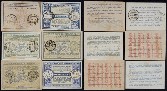 1929-48年寄云南国际回信券一组6件,包括万国邮联女神传信图等不同版式三种,包含阿尔及利亚、比利时、德国、印度支那、瑞士、中华民国,落地分盖云南府英汉腰框式昆明(云南府)双地名汉英三格式、昆明(七)汉英三格式及云南府汉英半切小圆戳,有一定收集难度,请预览,上中 ...