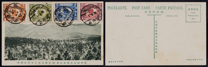 1929年孙中山国葬首日明信片,商务书信馆经售邮政明信片,摄影图:南京紫金山孙中山先生墓地全景,贴国葬纪念加盖“限滇贴用”邮票全套,销盖1分、1角盖云南府十八年六月一日英汉腰框日戳,4分、1元盖云南府一支局29.6.1戳,图画明信片类研究组集少见素材,片品完好。<br><br ...