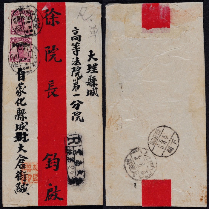 1929年云南大仓街寄大理挂号红条封,贴北京二版帆船加盖“限滇省贴用”5分两枚,双挂号邮资10分,销云南大仓街3月8日中转,落地大理府1929年3月9日到达戳,发、转、落邮政信息完整,民国云南小地名较少见,保存较好 ...