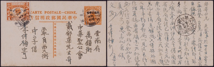 1929年第七版帆船1分限滇邮资片蒙自寄云南府,加贴限滇省贴用国葬纪念1分邮票一枚,销第一组“壁个火车邮局(一)六月廿八”英汉双文字腰框式日戳,落地云南府6月29日到达戳,收件人为云南集邮家戴郁华先生,片品完好<br><br>那家佑著:“限滇省贴用”邮票与“限滇省发寄”邮 ...