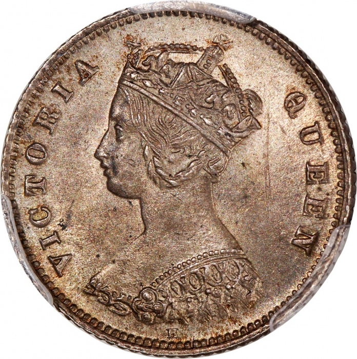 1876-H香港维多利亚一毫,窄H版,PCGS MS63,#46484226,VICTORIA铸打错落有致,人物栩栩如生,细节清晰饱满,仅得4枚获更高评分。Hong Kong, Victoria, 10 cents, 1876-H, Thin H Mintmark, PCGS MS63. #46484226. VICTORIA prominently raised and portrait struck with viv ...