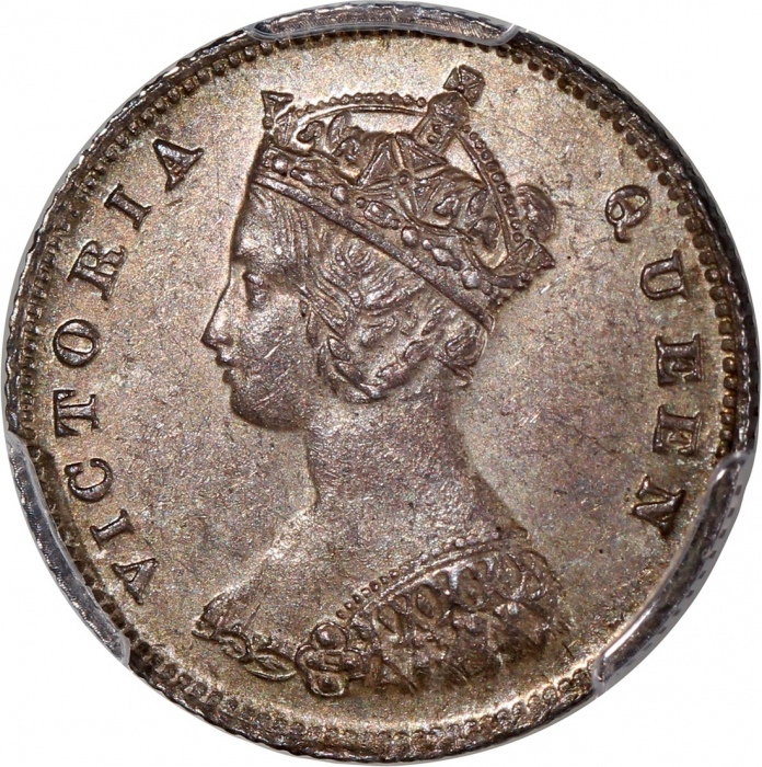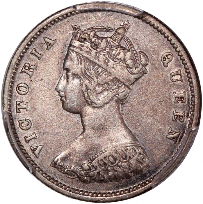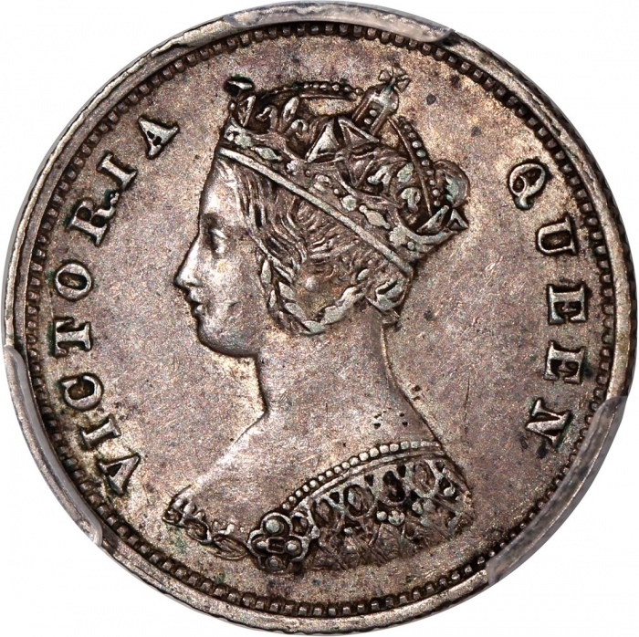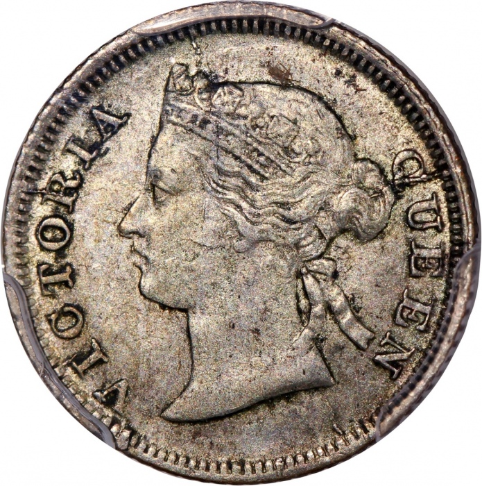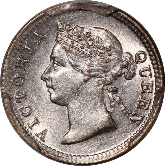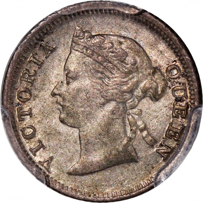1866年香港维多利亚五仙,PCGS MS65+,#46484295,4枚带+级之一,币身细节清晰易见。Hong Kong, Victoria, 5 cents, 1866, PCGS MS65+. #46484295. One of 4 examples with the coveted "plus grade". With sharp details remain