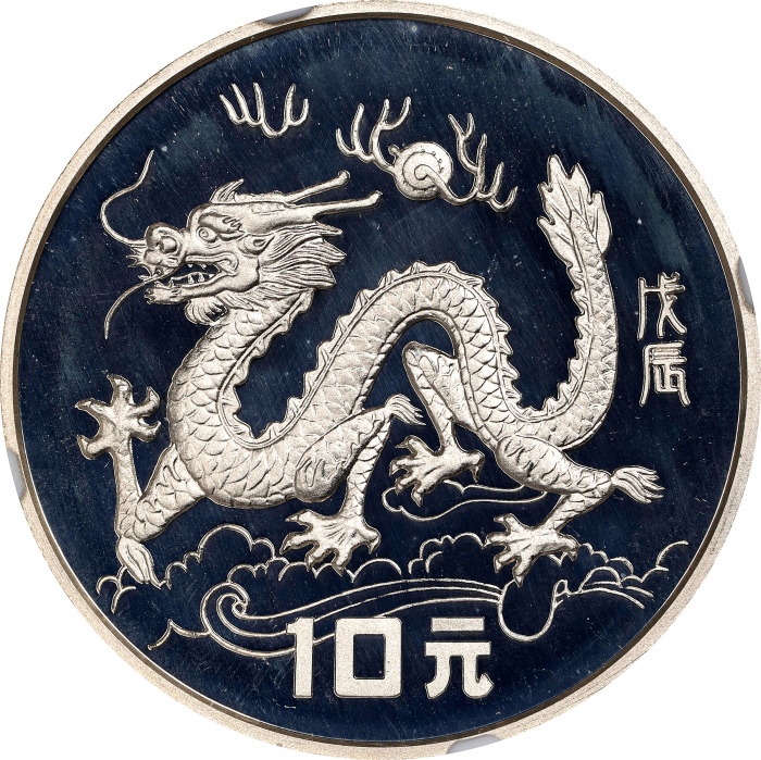 CHINA. 10 Yuan, 1988. Lunar Series, Year of the Dragon. NGC PROOF-68 Ultra Cameo. KM-193. A brilliant mirrorlike proof issue with just a bare hint of tone on its frosty surfaces.