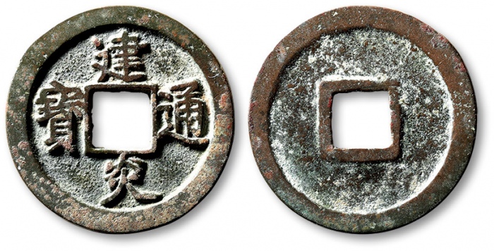“建炎通宝”折二一枚,点建,直径:27.6mm,地章平整,字口挺拔清晰,包浆醇熟,海外回流,极美品
