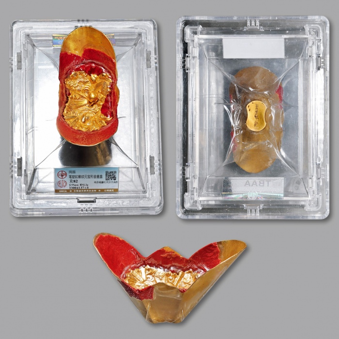 民国“笔锭如意”图元宝形金制首饰盒一件,南京杨庆和银楼制作,重:92.2g,造型优美,图案打制精美,少见,公博 美82(33004137)