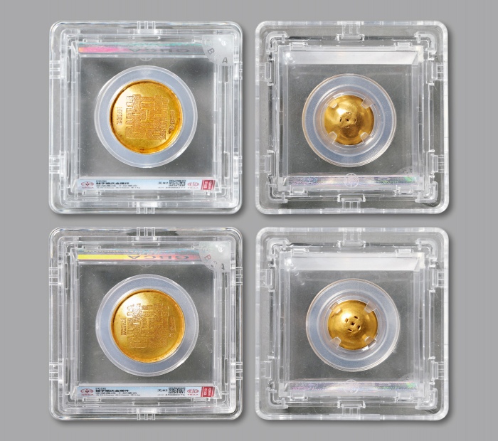 民国“禧”字纯金圆锭二枚一对,打“浙湖·万成·十足叶金”戳,重:14g,造型优美,金色纯正,寓意吉祥,少见,保存完好,公博 美82(35000276、35000277)