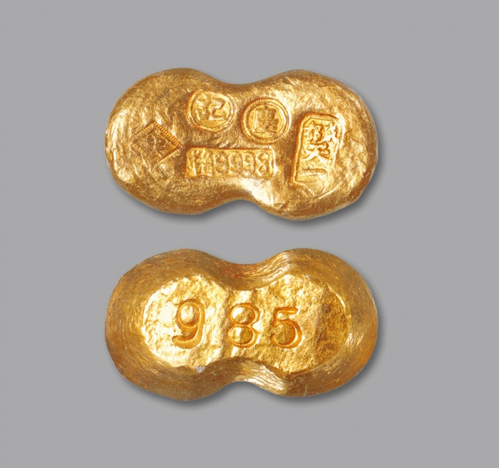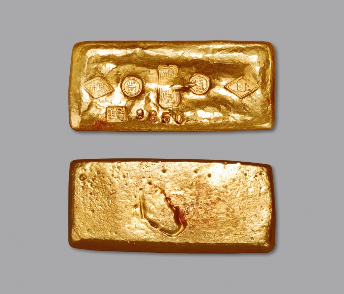 民国“兰州X庆·上上·足赤·丰·丰·重量9.850”十两金条一枚,重308:g,色泽纯正,金中泛红,戳记清晰可见,品相一流,十分难得,海外资深藏家旧藏,完全未使用品