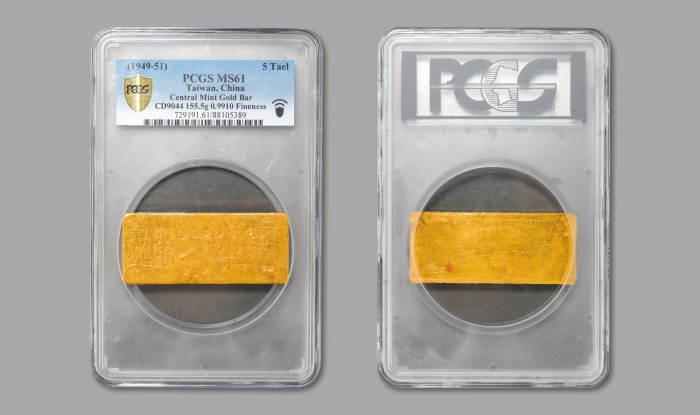 民国中央造币厂“布图”五两金条一枚,重:155.5g,编号:CD9044,成色:9910,市两:4.977,图案清晰完整,色泽纯正,罕见之顶级品相,十分难得,金盾PCGS MS61(88105389)为此公司此品种仅四枚之第二名分数,第一名仅一枚 ...