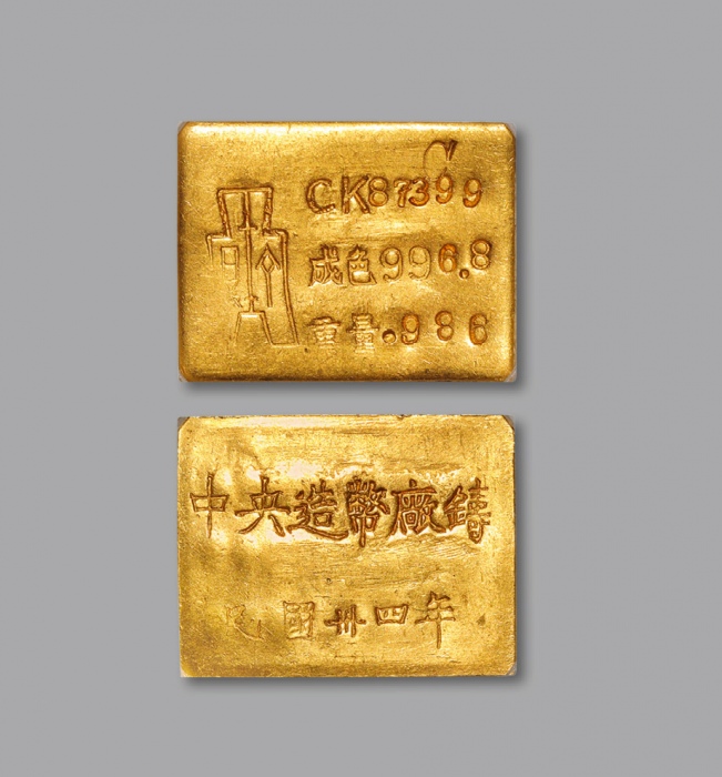 民国中央造币厂“布图”一两金条一枚,重:30.8g,编号:CK87399,成色:996.8,重量:0.986,戳记清晰,金色纯正,顶级品相,十分难得,金盾PCGS MS62(80016534)为此公司此品种少见之第二名分数,第一名仅六枚 ...