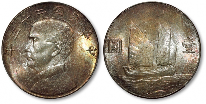 民国二十三年孙中山像背帆船壹圆银币一枚,打制规范清晰,图案立体饱满,底版平滑,灰色五彩包浆,底光丝滑闪亮,状态上佳,金盾PCGS MS64(88102702)