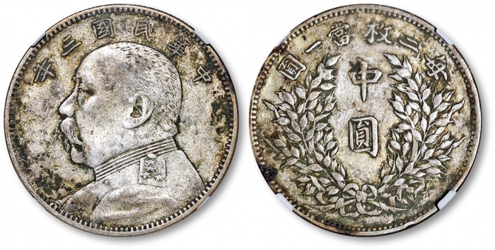 民国九年袁世凯像壹圆银币一枚,精发,打制规范,灰色老包浆,底光柔亮,状态自然,金盾PCGS AU50(88102674)