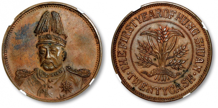 民国袁世凯戎装像背嘉禾二十文臆造铜元一枚,少见,刻模细致,打制规范,压力十足,人像立体饱满,惟妙惟肖,底版平滑,醇厚老包浆,状态自然,沪上藏家出品,NGC AU58BN(3592126-018)