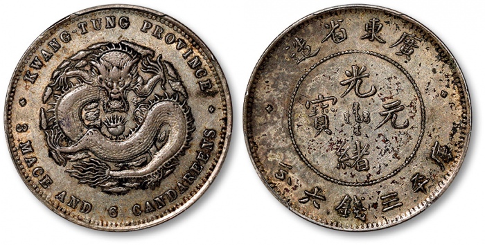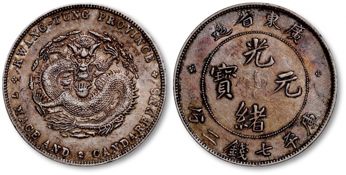 清广东省造光绪元宝库平七钱二分银币一枚,打制规范清晰,龙鳞基本完整,棕灰色包浆,底光柔亮,近未使用品