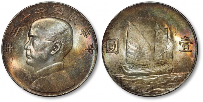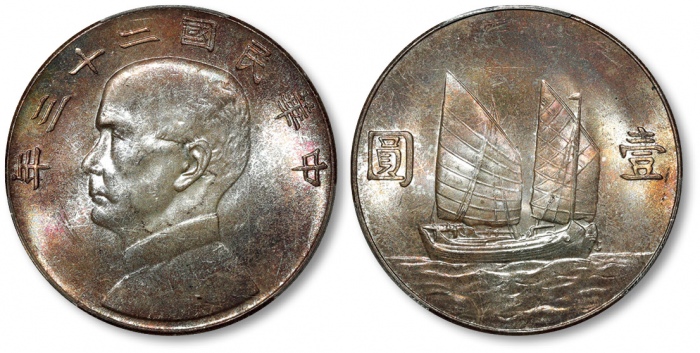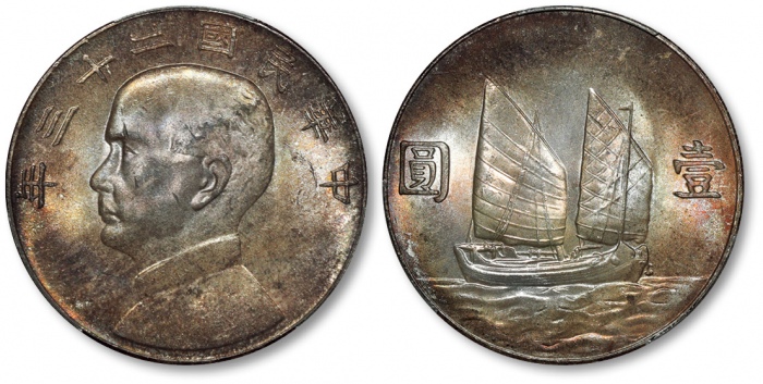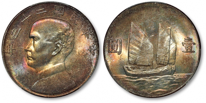 民国二十三年孙中山像背帆船壹圆银币一枚,打制规范清晰,图案立体饱满,灰色五彩包浆,底光丝滑柔亮,状态上佳,金盾PCGS MS63(88102680)