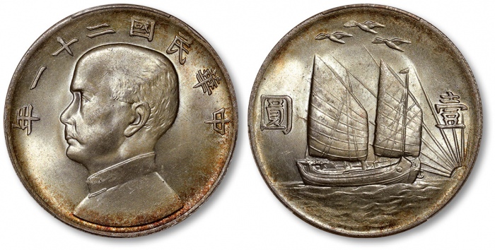 民国二十一年孙中山像背帆船三鸟壹圆银币一枚,打制规范,人像图案高挺饱满,细节清晰,底版平滑光洁,原味黄油包浆,旋转底光,丝滑柔亮,状态极佳,金盾PCGS MS64(85625184)