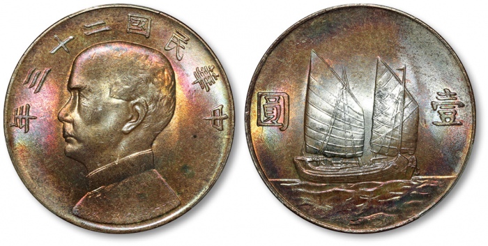 民国二十三年孙中山像背帆船壹圆飘带银币一枚,打制规范清晰,底版平整,原味环五彩包浆,旋转底光,丝滑柔亮,状态上佳,金盾PCGS MS63(88115296)
