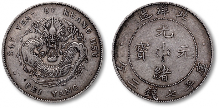 清光绪34年北洋造光绪元宝库平七钱二分银币一枚,整体清晰,灰色老包浆,状态自然,金盾PCGS VF35(88102044)